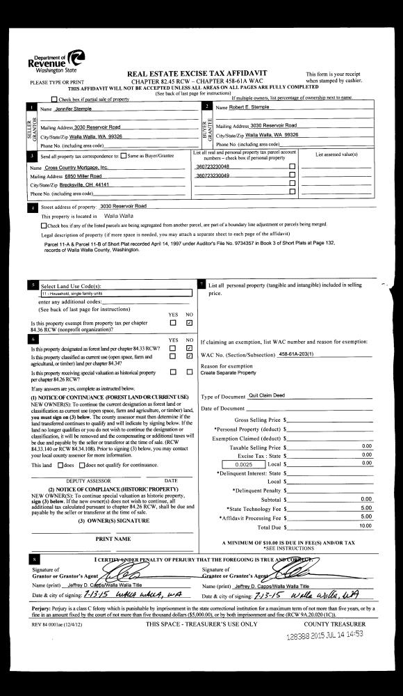| 1 | 07/13/2015 | QCD | QUIT CLAIM DEED | STEMPLE ROBERT & JENNIFER | STEMPLE ROBERT | 2 PARCELS | | $0.00 | 128388 | 2015-06025 |