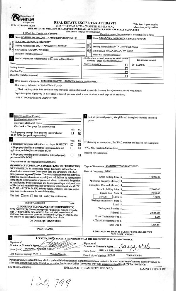 | 3 | 10/07/2011 | WARRANTY D | WARRANTY DEED | WALCOTT, NORMAN JAY | MERCADO, BRANDON M | | | $172,000.00 | 120799 | 2011-07887 |