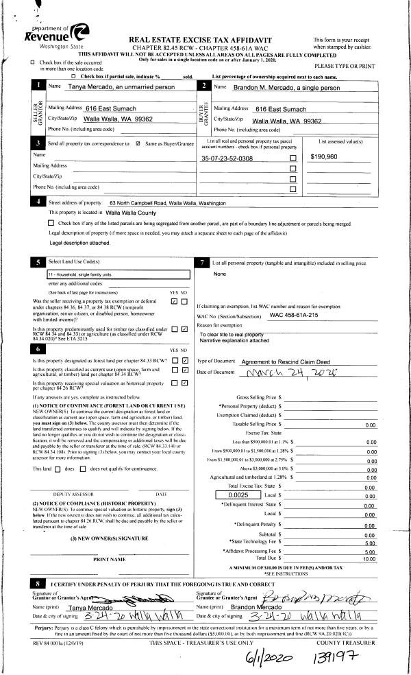 | 2 | 10/19/2019 | QCD | QUIT CLAIM DEED | MERCADO BRANDON M | MERCADO TANYA | | | $0.00 | 138488 | 2020-00677 |