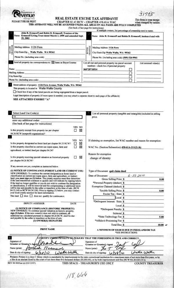 | 5 | 06/28/2010 | QCD | QUIT CLAIM DEED | ERMACOFF LIVING TRUST | ERMACOFF JOHN R & ROBIN D (JTWRS) | | | | 118666 | 2010-04975 |