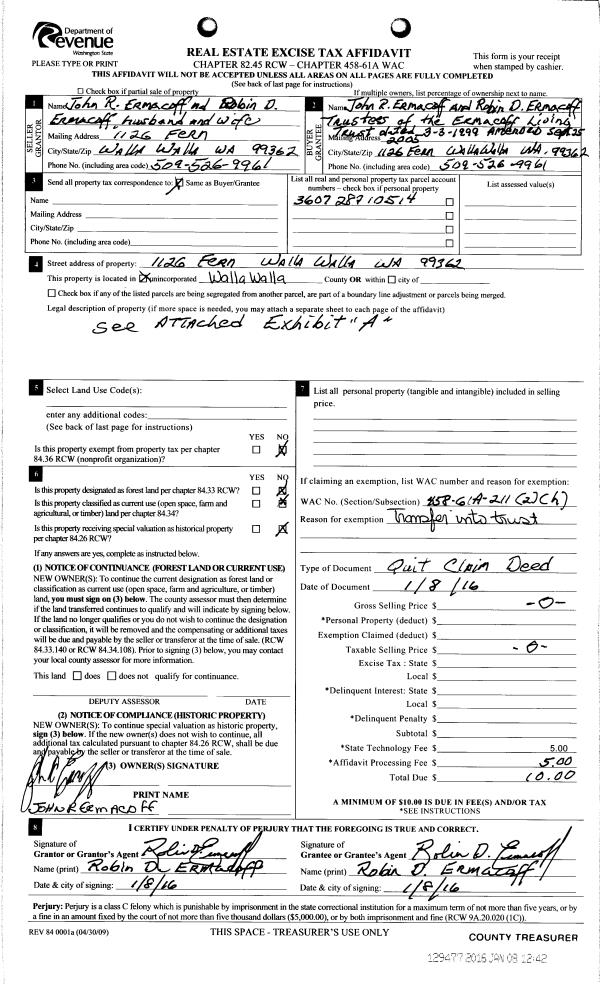 | 4 | 01/08/2015 | QCD | QUIT CLAIM DEED | ERMACOFF JOHN R & ROBIN D (JTWRS) | ERMACOFF LIVING TRUST | 2 PARCELS | | $0.00 | 129477 | 2016-00158 |