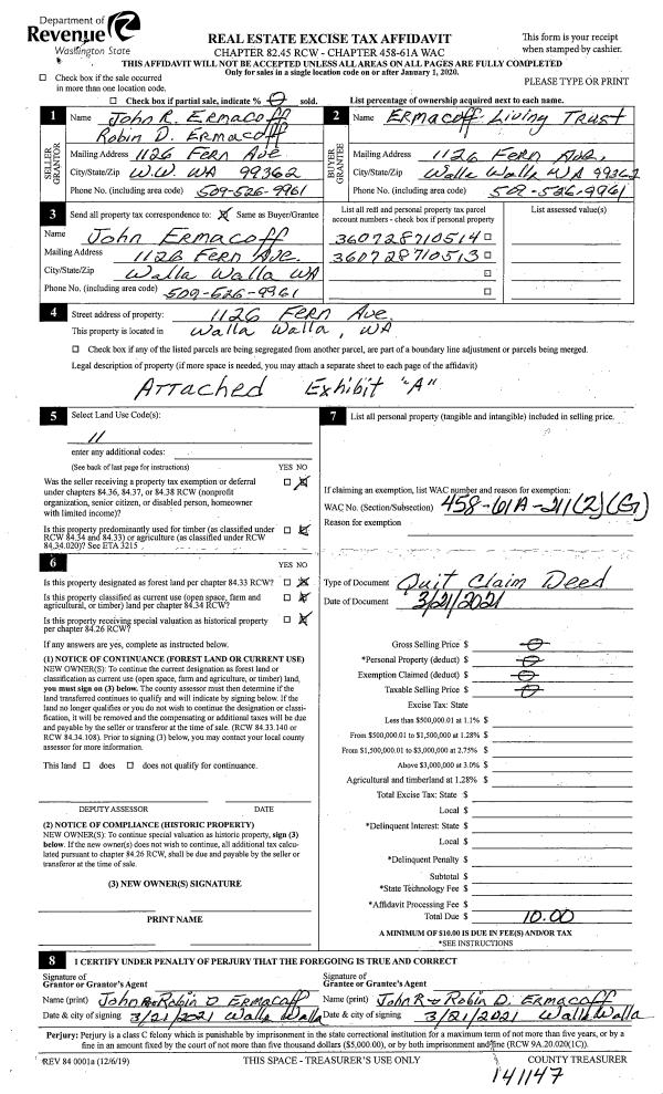 | 2 | 03/21/2021 | QCD | QUIT CLAIM DEED | ERMACOFF LIVING TRUST | ERMACOFF LIVING TRUST | | 2 PARCELS | $0.00 | 141147 | 2021-03226 |