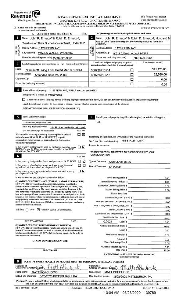 | 3 | 09/11/2020 | QCD | QUIT CLAIM DEED | ERMACOFF LIVING TRUST | ERMACOFF JOHN R & ROBIN D (JTWRS) | | 2 PARCELS | | 139789 | 2020-09230 |