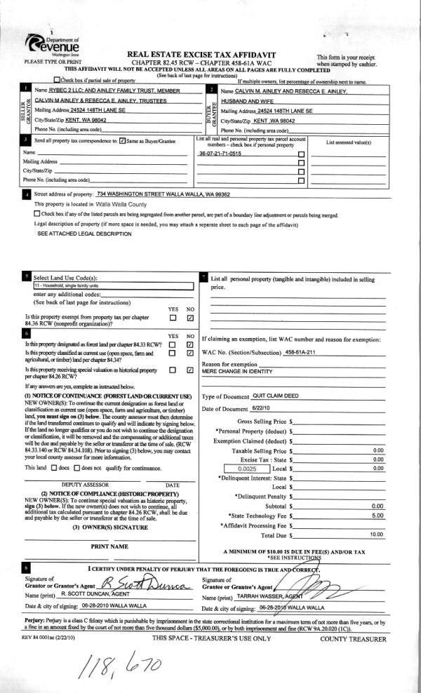 | 3 | 06/28/2010 | QCD | QUIT CLAIM DEED | RYEBEC 2 LLC | AINLEY, CALVIN M & REBECCA E | | | | 118670 | 2010-04994 |