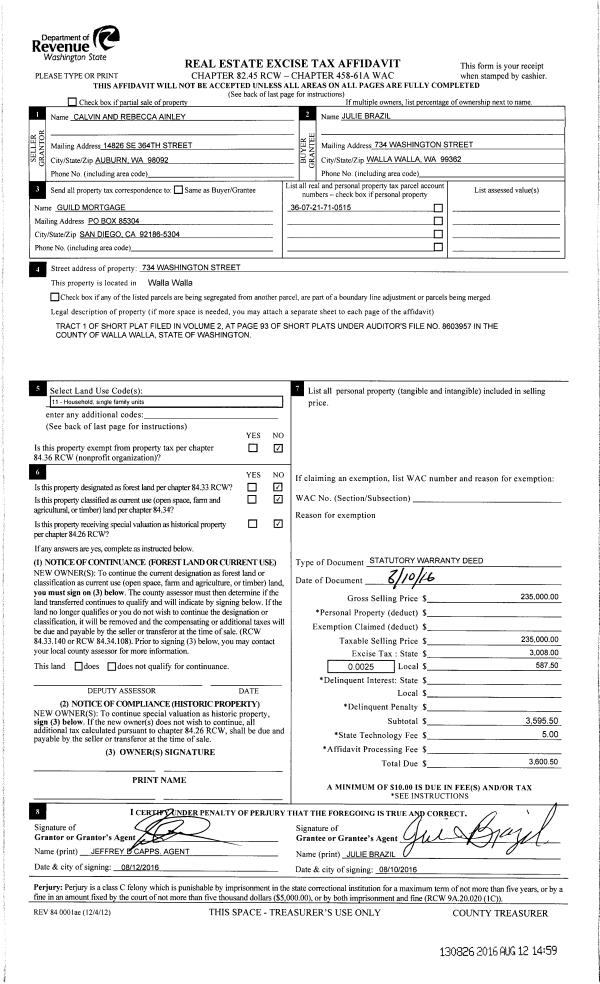| 2 | 08/12/2016 | SWD | STATUTORY WARRANTY DEED | AINLEY CALVIN M & REBECCA E | BRAZIL JULIE | | | $235,000.00 | 130826 | 2016-06437 |