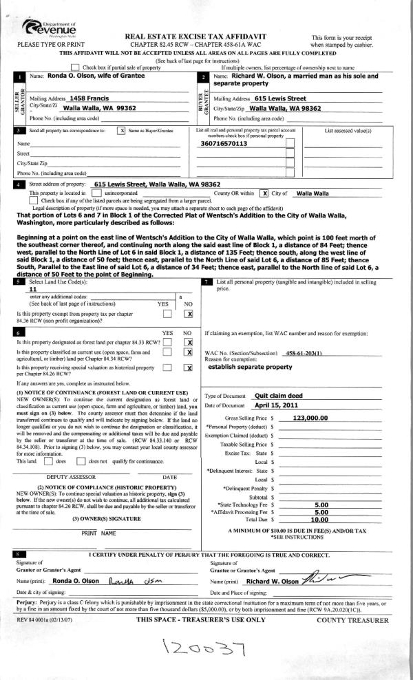 | 3 | 04/22/2011 | QCD | QUIT CLAIM DEED | OLSON, RONDA O | OLSON, RICHARD W | | | $0.00 | 120037 | 2011-03273 |