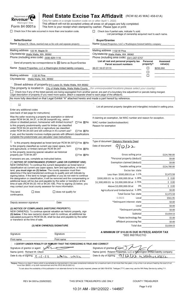 | 2 | 09/12/2022 | SWD | STATUTORY WARRANTY DEED | OLSON RICHARD W | ROLAND PROPERTIES LLC | | | $224,780.00 | 144667 | 2022-07569 |