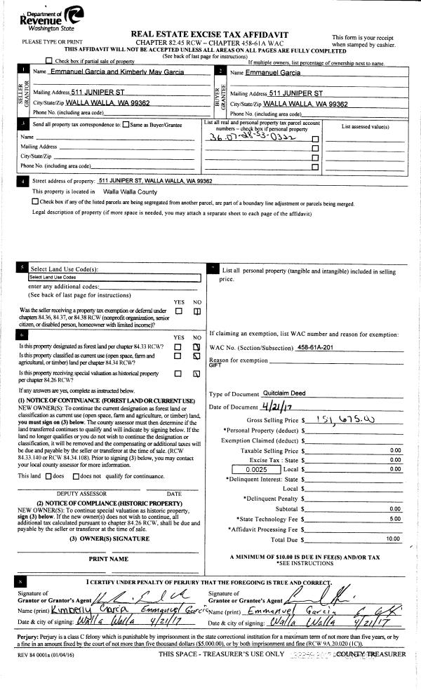 | 2 | 04/25/2017 | QCD | QUIT CLAIM DEED | GARCIA KIMBERLY MAY | GARCIA EMMANUEL | | | | 132259 | 2017-03095 |