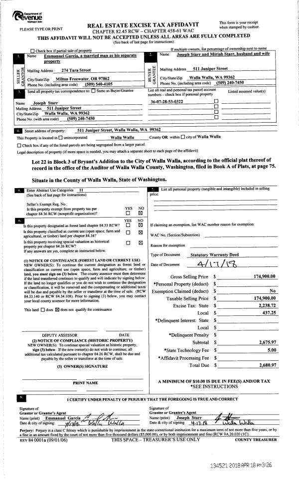 | 1 | 04/18/2018 | SWD | STATUTORY WARRANTY DEED | GARCIA EMMANUEL | STARR JOSEPH & MIRIAH | | | $174,900.00 | 134521 | 2018-03039 |