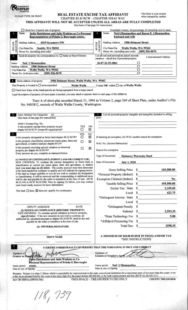 | 3 | 07/12/2010 | WARRANTY D | WARRANTY DEED | BURROUGHS, FRIEDA G ESTATE OF | LHOMMEDIEU, NEIL & KAREN E | | | $169,500.00 | 118739 | 2010-05331 |