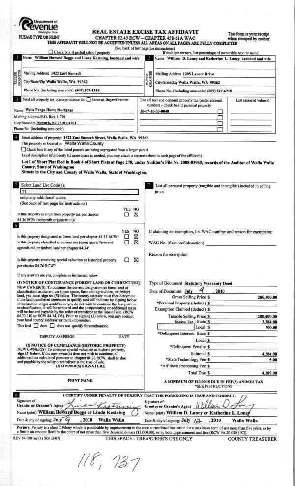 | 2 | 07/12/2010 | WARRANTY D | WARRANTY DEED | BOGGS, WILLIAM H | LONEY, WILLIAM D & KATHERINE L | | | $280,000.00 | 118737 | 2010-05318 |