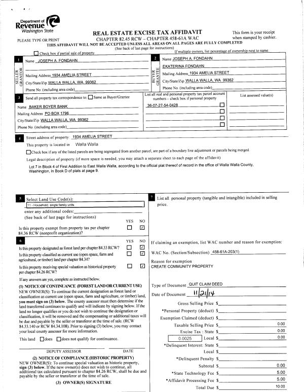| 2 | 11/26/2014 | QCD | QUIT CLAIM DEED | FONDAHN JOSEPH A | FONDAHN JOSEPH A & EKATERINA | | | $0.00 | 127019 | 2014-08604 |