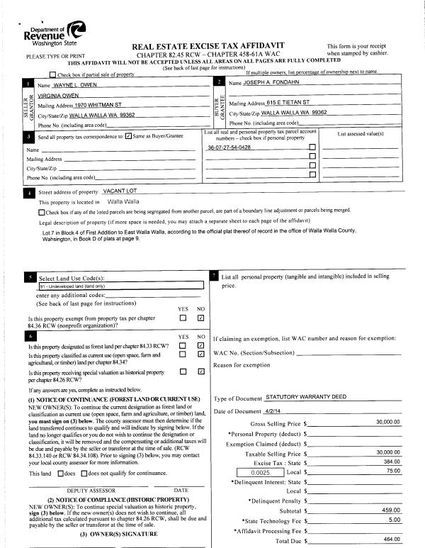 | 3 | 04/03/2014 | SWD | STATUTORY WARRANTY DEED | OWEN WAYNE L & VIRGINIA | FONDAHN JOSEPH A | | | $30,000.00 | 125673 | 2014-02271 |