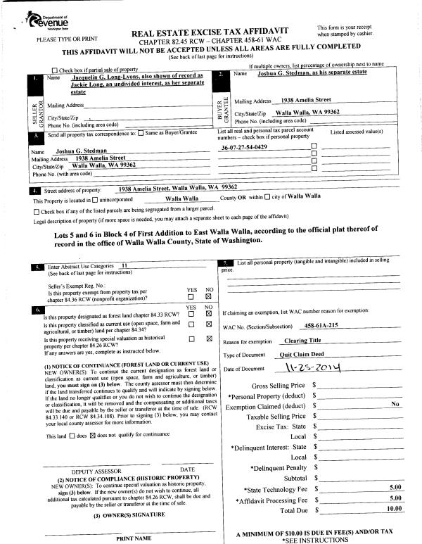 | 8 | 11/25/2014 | QCD | QUIT CLAIM DEED | LONG-LYONS JACUELIN G | STEDMAN JOSHUA G | | | $0.00 | 127283 | 2015-00379 |