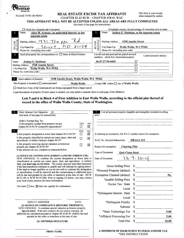 | 6 | 12/09/2014 | QCD | QUIT CLAIM DEED | ARMOUR ALICE M | STEDMAN JOSHUA G | | | | 127285 | 2015-00381 |