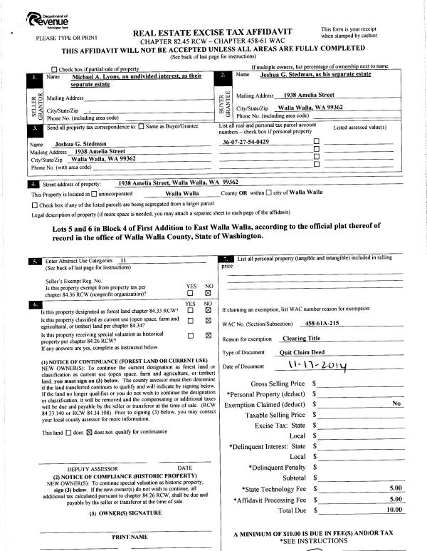 | 3 | 12/01/2014 | QCD | QUIT CLAIM DEED | LYONS JAMES E | STEDMAN JOSHUA G | | | | 127288 | 2015-00384 |