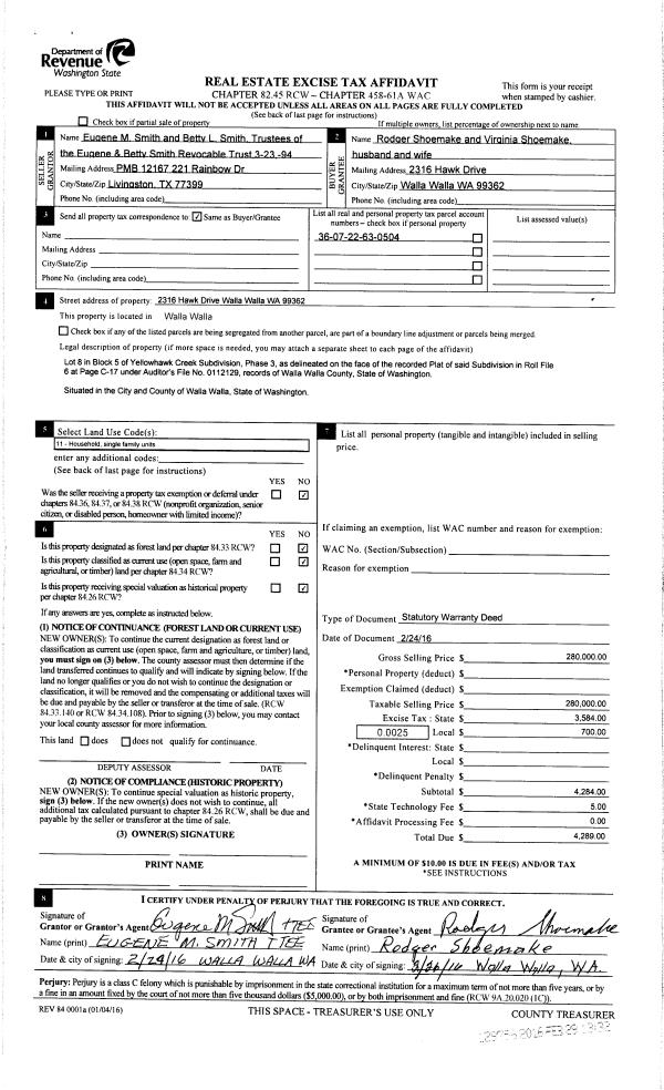 | 1 | 02/29/2016 | SWD | STATUTORY WARRANTY DEED | THE EUGENE & BETTY SMITH REVOCALBE TRST | SHOEMAKE RODGER R & VIRGINIA | | | $280,000.00 | 129756 | 2016-01528 |