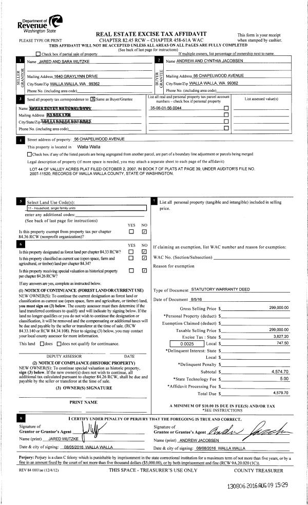 | 2 | 08/09/2016 | SWD | STATUTORY WARRANTY DEED | WUTZKE JARED L & SARA a | JACOBSEN ANDREW & CYNTHIA H | | | $299,000.00 | 130806 | 2016-06366 |