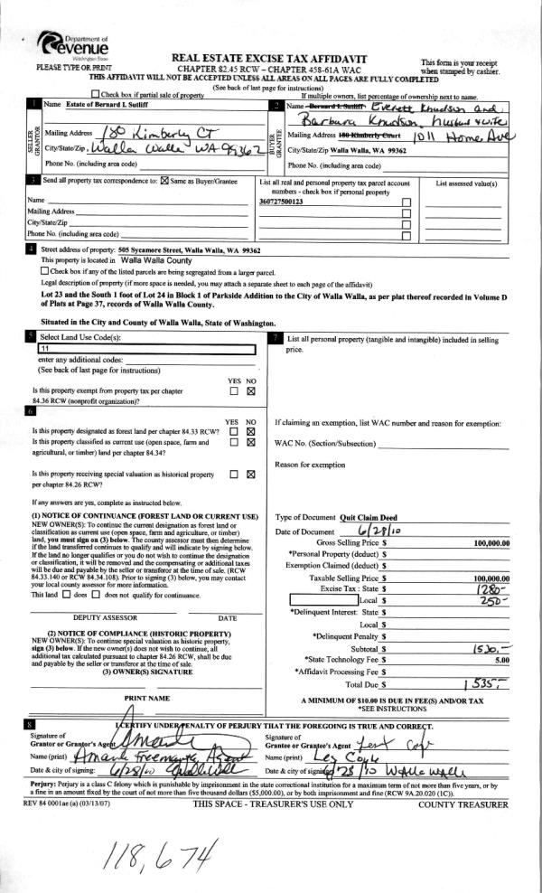| 2 | 06/28/2010 | QCD | QUIT CLAIM DEED | SUTLIFF, BERNARD I ESTATE OF | KNUDSON, EVERETT & BARBARA | | | $100,000.00 | 118674 | 2010-04995 |