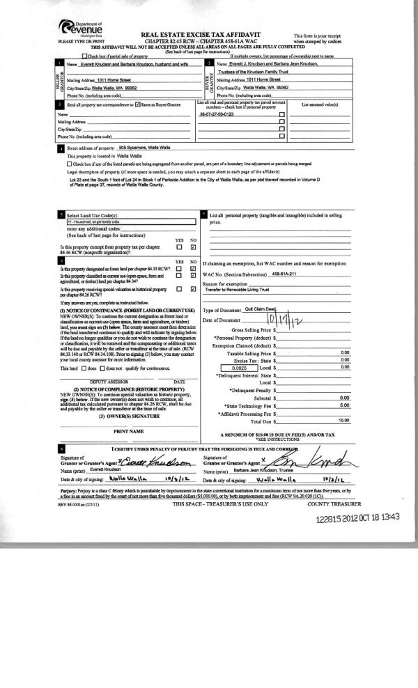 | 1 | 10/18/2012 | QCD | QUIT CLAIM DEED | KNUDSON, EVERETT & BARBARA | KNUDSON FAMILY TRUST | | | $0.00 | 122815 | 2012-09168 |