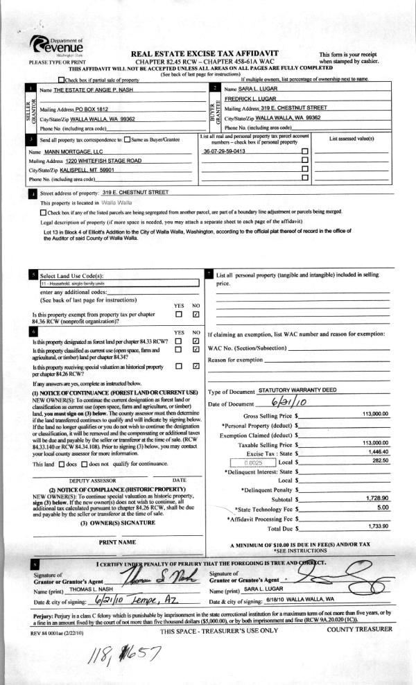 | 4 | 06/24/2010 | WARRANTY D | WARRANTY DEED | NASH, ANGELINE P ESTATE OF | LUGAR, FREDRICK L | | | $113,000.00 | 118657 | 2010-04898 |