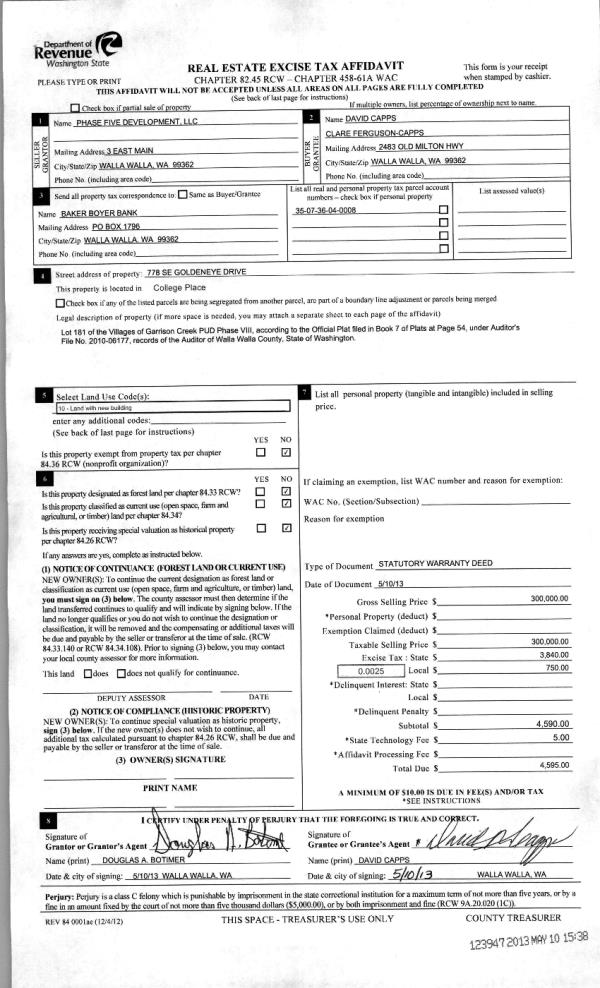 | 3 | 05/10/2013 | WARRANTY D | WARRANTY DEED | PHASE FIVE DEVELOPMENT LLC | CAPPS, DAVID | | | $300,000.00 | 123947 | 2013-04722 |