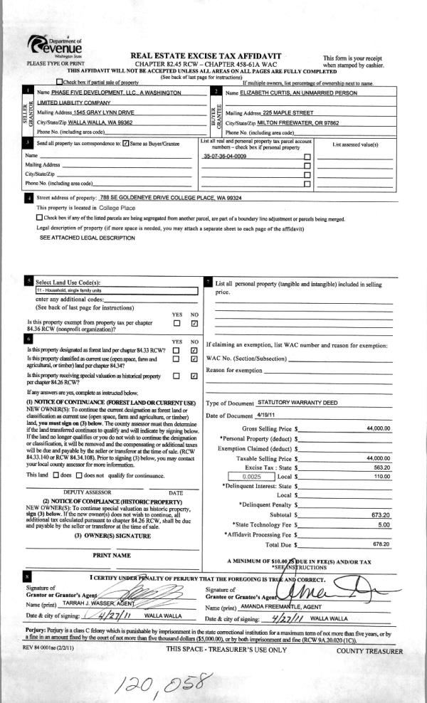 | 4 | 04/27/2011 | WARRANTY D | WARRANTY DEED | PHASE FIVE DEVELOPMENT LLC | CURTIS, ELIZABETH | | | $44,000.00 | 120058 | 2011-03390 |