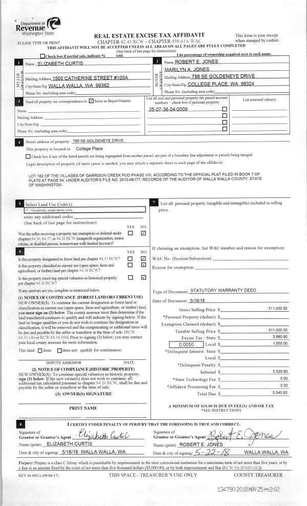 | 3 | 05/25/2018 | SWD | STATUTORY WARRANTY DEED | CURTIS ELIZABETH | JONES ROBERT E & MARILYN A | | | $311,000.00 | 134790 | 2018-04140 |