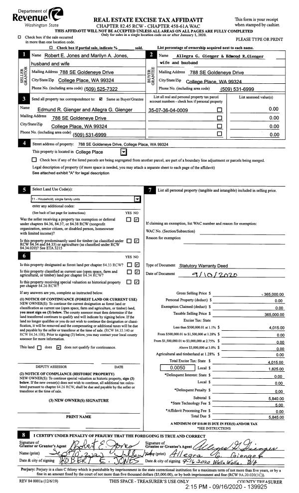 | 2 | 09/16/2020 | SWD | STATUTORY WARRANTY DEED | JONES ROBERT E & MARILYN A | GIENGER ALLEGRA G & EDMUND R | | | $365,000.00 | 139925 | 2020-09494 |