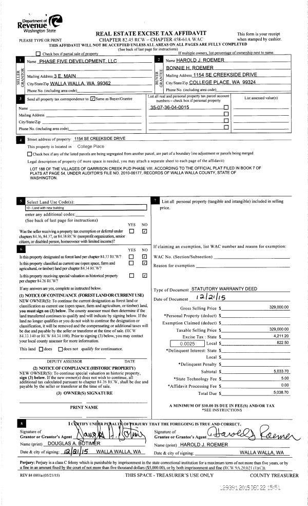 | 1 | 12/22/2015 | SWD | STATUTORY WARRANTY DEED | PHASE FIVE DEVELOPMENT LLC | ROEMER HAROLD J & BONNIE H | | | $329,000.00 | 129391 | 2015-10960 |