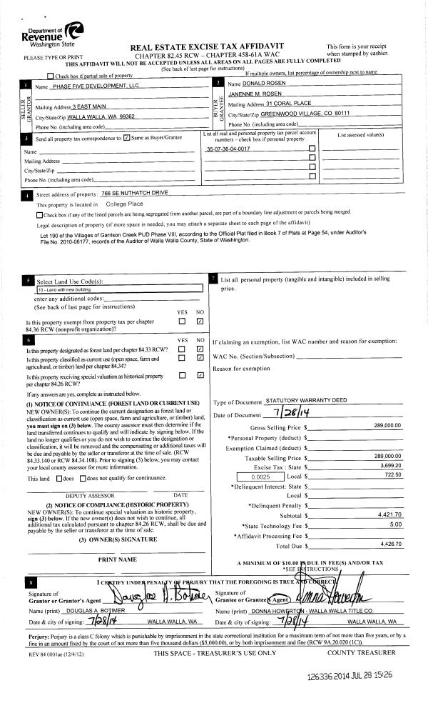 | 3 | 07/28/2014 | SWD | STATUTORY WARRANTY DEED | PHASE FIVE DEVELOPMENT LLC | ROSEN DONALD & JANENNE M | | | $289,000.00 | 126336 | 2014-05325 |