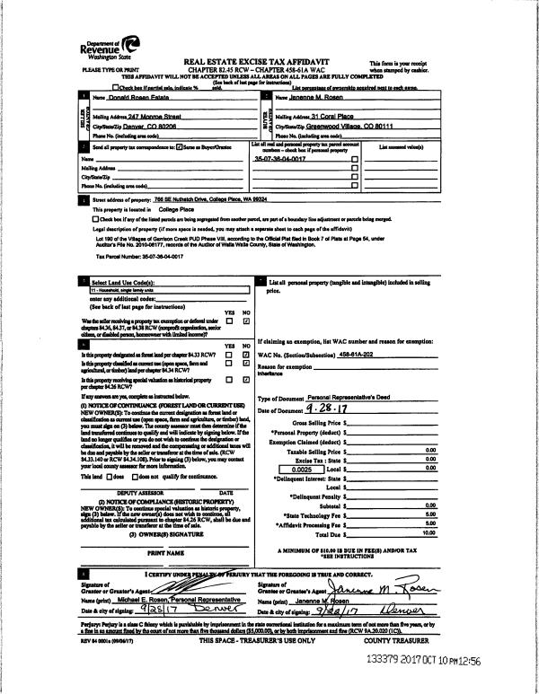 | 2 | 09/28/2017 | DPR | DEED OF PERSONAL REPRESENTATIVE | ROSEN DONALD & JANENNE M | ROSEN JANENNE M | | | $0.00 | 133379 | 2017-08046 |