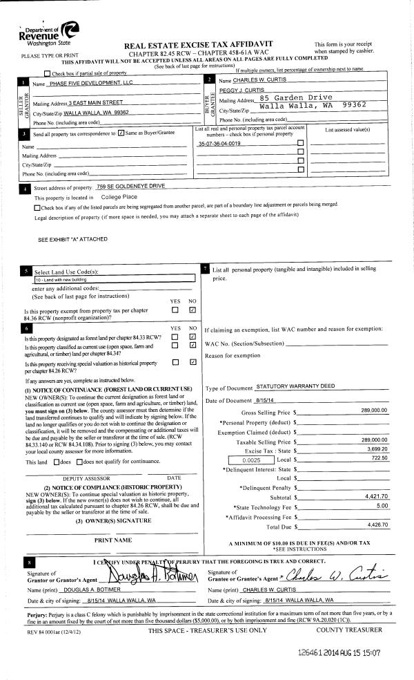 | 2 | 08/15/2014 | SWD | STATUTORY WARRANTY DEED | PHASE FIVE DEVELOPMENT LLC | CURTIS CHARLES W & PEGGY J | | | $289,000.00 | 126461 | 2014-05902 |