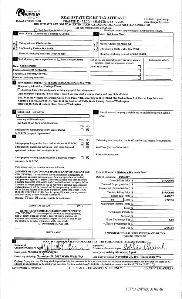 | 2 | 11/30/2017 | SWD | STATUTORY WARRANTY DEED | LOOMIS LARRY L & CATHERINE R | MOORE JUDITH ANN | | | $349,900.00 | 133714 | 2017-09596 |