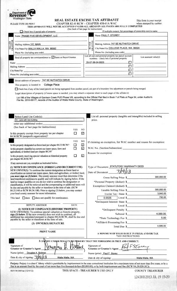 | 5 | 07/19/2013 | WARRANTY D | WARRANTY DEED | PHASE FIVE DEVELOPMENT LLC | STOREY, PAUL F | | | $300,000.00 | 124308 | 2013-07262 |