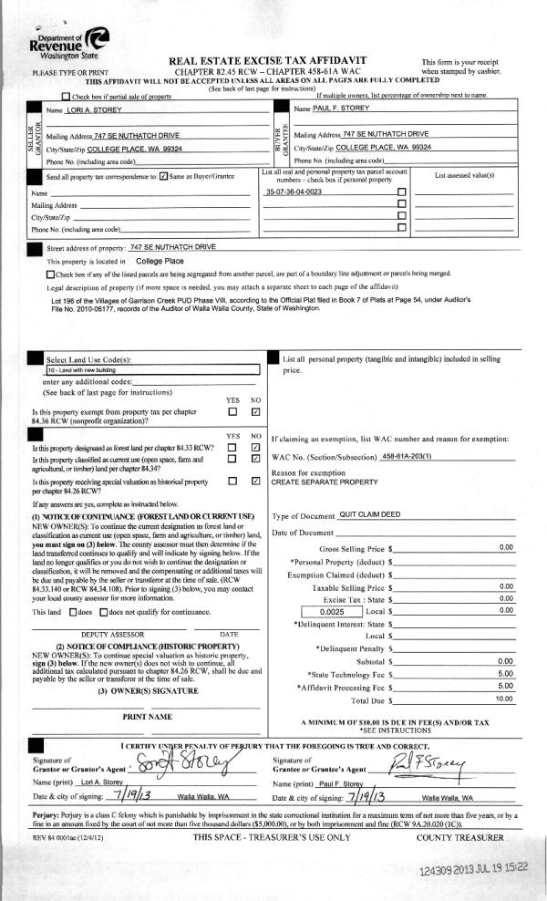 | 6 | 07/19/2013 | QCD | QUIT CLAIM DEED | STOREY, LORI A | STOREY, PAUL F | | | $0.00 | 124309 | 2013-07283 |