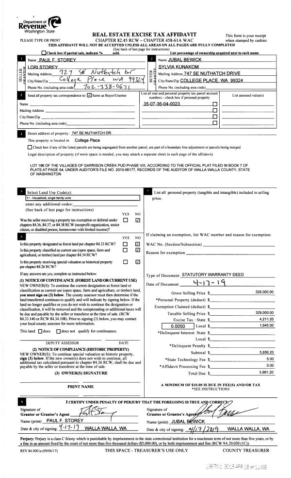 | 3 | 04/18/2019 | SWD | STATUTORY WARRANTY DEED | STOREY PAUL F & LORI | BEWICK JUBAL & SYLVIA KUNAKOM | | | $329,000.00 | 136701 | 2019-02455 |