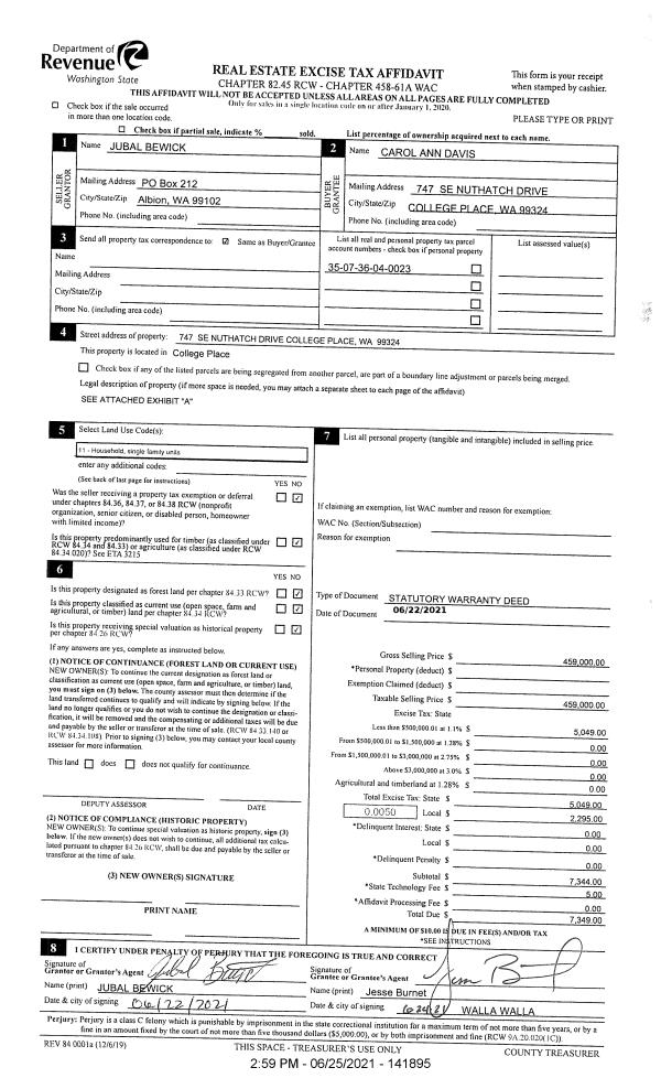 | 1 | 06/25/2021 | SWD | STATUTORY WARRANTY DEED | BEWICK JOBAL | DAVIS CAROL ANN | | | $459,000.00 | 141895 | 2021-07753 |