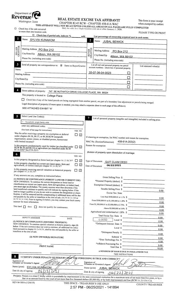 | 2 | 06/25/2021 | SWD | STATUTORY WARRANTY DEED | KUNAKOM SYLVIA | BEWICK JOBAL | | | $0.00 | 141894 | 20210-07752 |