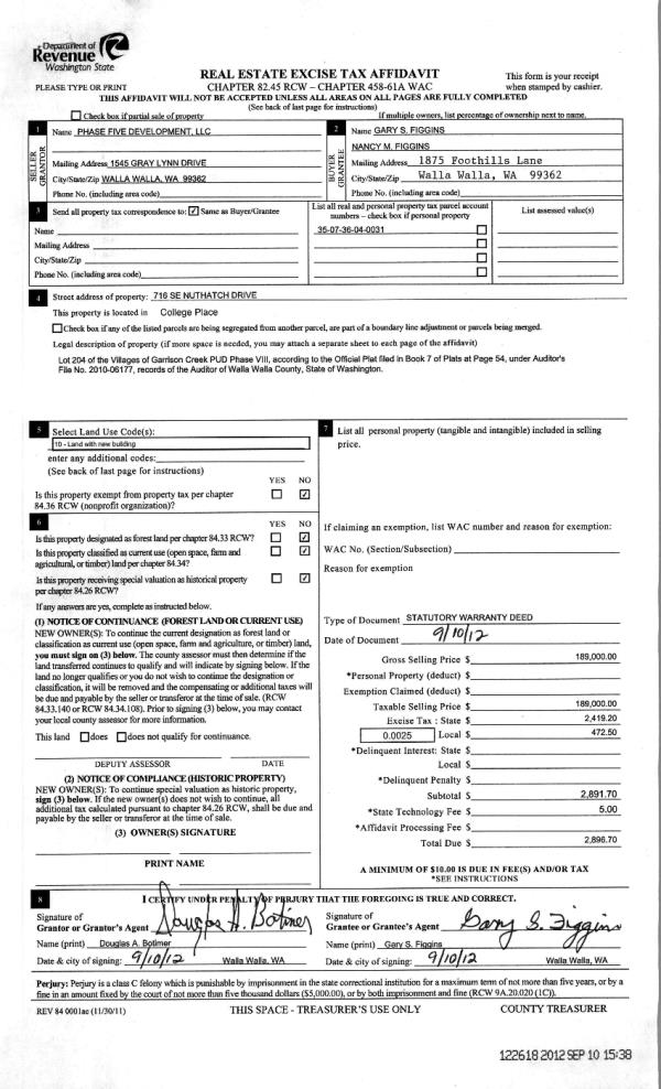 | 3 | 09/10/2012 | WARRANTY D | WARRANTY DEED | PHASE FIVE DEVELOPMENT LLC | FIGGINS, GARY & NANCY | | | $189,000.00 | 122618 | 2012-07888 |