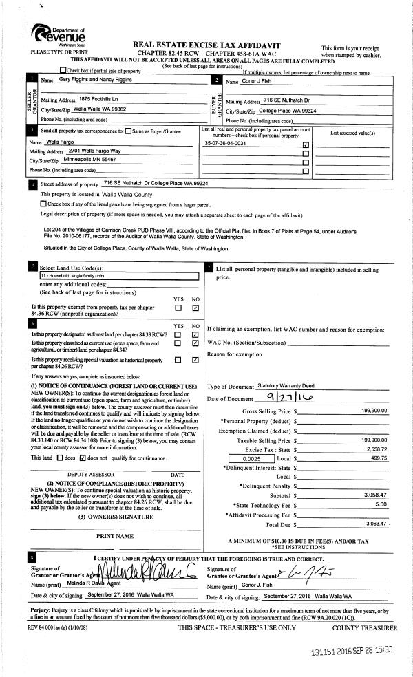 | 2 | 09/28/2016 | SWD | STATUTORY WARRANTY DEED | FIGGINS GARY & NANCY | FISH CONOR J | | | $199,900.00 | 131151 | 2016-07988 |