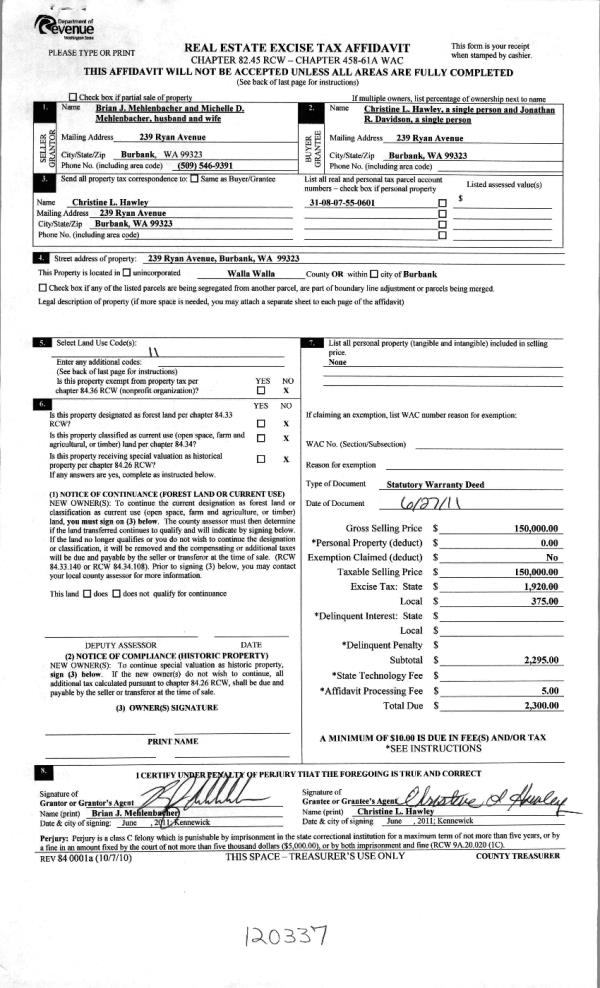 | 7 | 06/30/2011 | WARRANTY D | WARRANTY DEED | MEHLENBACHER, BRIAN J & MICHEL | DAVIDSON, JONATHAN R | | | $150,000.00 | 120337 | 2011-05051 |