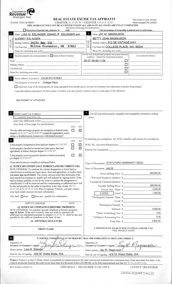| 2 | 04/05/2018 | SWD | STATUTORY WARRANTY DEED | ESLINGER LISA M | MAGNUSON JAY W & BETTY JEAN | | | $260,000.00 | 134454 | 2018-02633 |