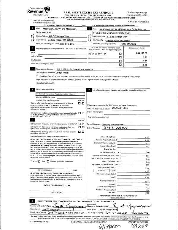 | 1 | 06/17/2020 | SWD | STATUTORY WARRANTY DEED | MAGNUSON JAY W & BETTY JEAN | MAGNUSON FAMILY TRUST | | | $0.00 | 139299 | 2020-05534 |
