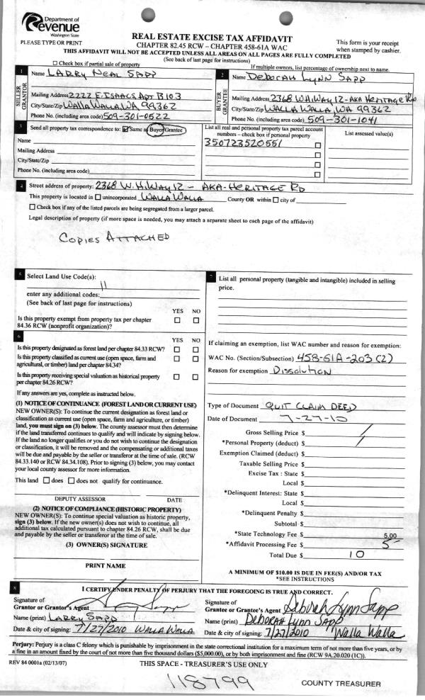 | 2 | 07/28/2010 | QCD | QUIT CLAIM DEED | SAPP, LARRY N | SAPP, DEBORAH LYNN | | | | 118799 | 2010-05805 |