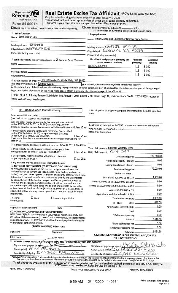 | 1 | 12/11/2020 | SWD | STATUTORY WARRANTY DEED | SOUTH WILBUR LLC | JAFFEE MIRIAM | | | $179,000.00 | 140534 | 2020-13126 |