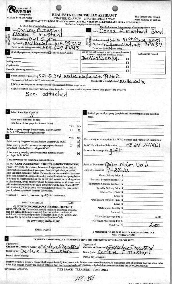 | 4 | 07/29/2010 | QCD | QUIT CLAIM DEED | MUSTARD, DARLENE | BOND, DONNA F MUSTARD | | | | 118801 | 2010-05878 |