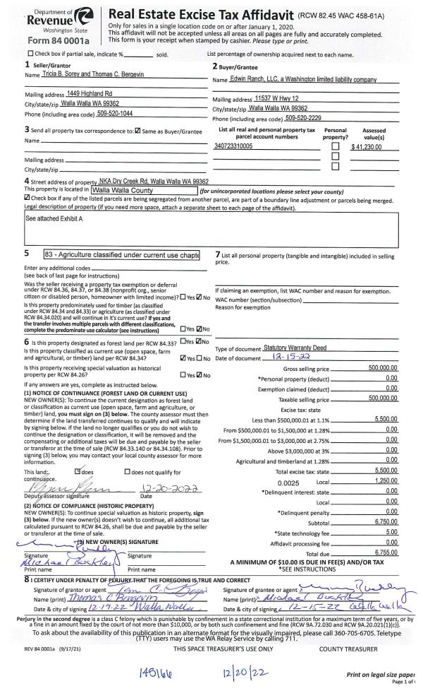 | 1 | 12/20/2022 | WARRANTY D | WARRANTY DEED | BERGEVIN THOMAS C | EDWIN RANCH LLC | | | $500,000.00 | 145166 | 2022-09814 |