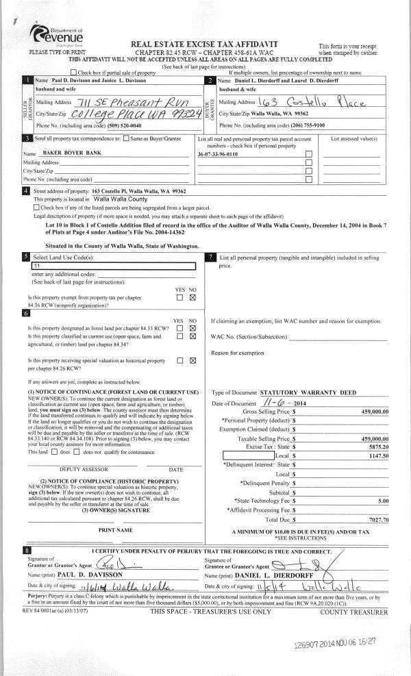 | 1 | 11/06/2014 | SWD | STATUTORY WARRANTY DEED | DAVISSON PAUL D & JANICE L | DIERDORFF DANIEL L & LAUREL D | | | $459,000.00 | 126907 | 2014-08112 |
