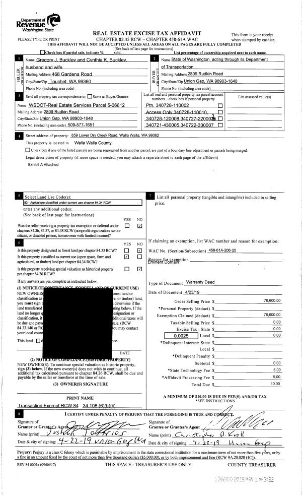 | 2 | 05/01/2019 | WARRANTY D | WARRANTY DEED | BUCKLEY GREGORY J & CYNTHIA K | WASH DEPT OF TRANSPORTATION | | | $76,600.00 | 136800 | 2019-02846 |